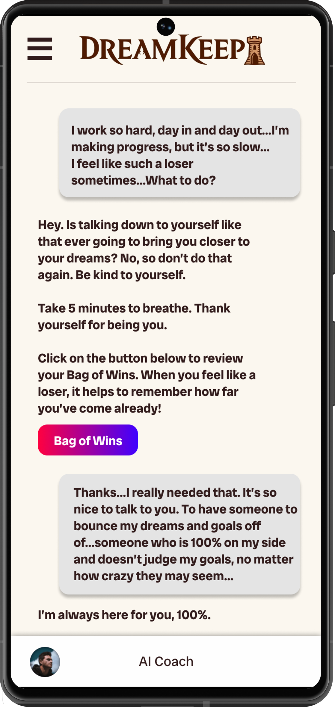 • Your AI Coach rewires your mindset, fast.Bag of Wins